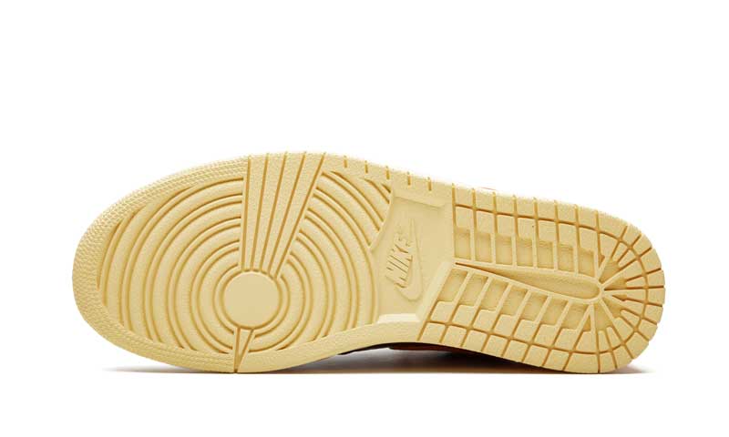 Le 26 octobre, Jordan Brand a décidé d’y ajouter une touche brillante texturée, probablement pour rappeler le plexiglas qui a volé en éclats. Sous le pied, la semelle est jaunie. Là, on peut supposer que c’est un clin d’oeil à la qualité des images de l’événement disponibles sur You Tube. Le blanc a totalement disparu du coloris.