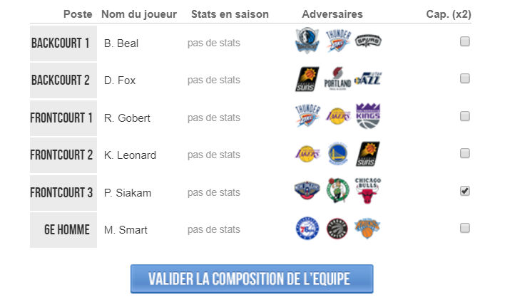 Chaque équipe se compose de six joueurs : un cinq majeur et un 6e homme. Nous les avons classés par catégorie : backcourt et frontcourt. Vous devez donc choisir deux joueurs du backcourt et trois joueurs du frontcourt. Rien ne vous empêche désormais de jouer avec LeBron, Durant et Leonard dans votre cinq de départ… Ensuite, parmi les 6e hommes, nous avons sélectionné les meilleurs remplaçants par franchise. En cours de saison, nous nous donnons la possibilité de modifier les catégories. Par exemple, pour un changement de titulaire dans une équipe ou lors d’une blessure importante.