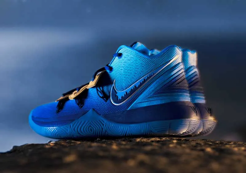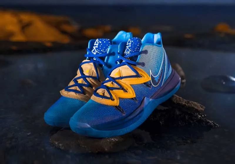 C'est probablement une des dernières versions de la Kyrie 5 qui sera mise en vente. Et elle est superbe. Avec ses nuances de bleu et son empiècement doré, cette collaboration avec Concepts est baptisée “Orion's Belt.”