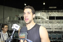Brandon Jennings se prête avec aisance et plaisir au Media Day sur le parquet du Center Court de la Jam Session. Natif de la Cité des anges, le meneur des Bucks oublie pour trois jours une saison pour l’instant décevante, individuellement et collectivement. |