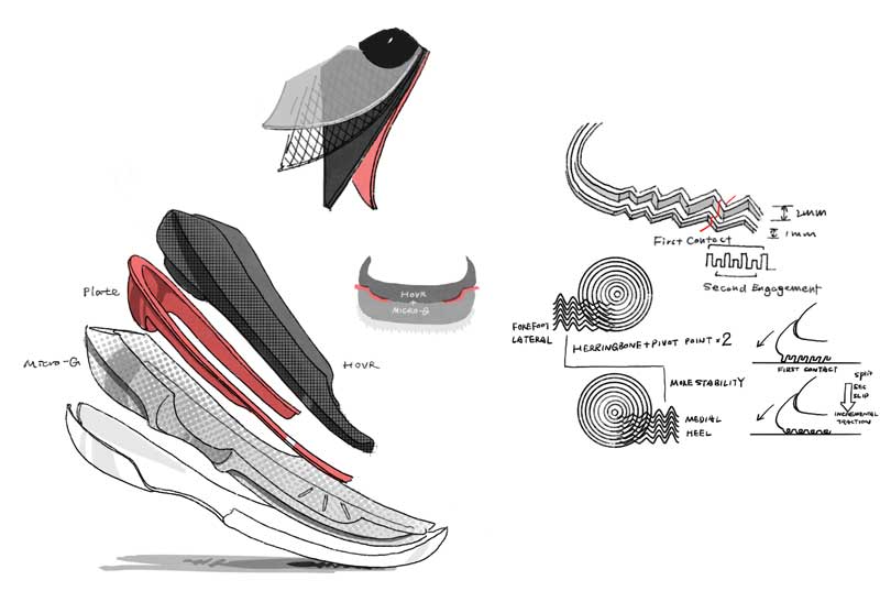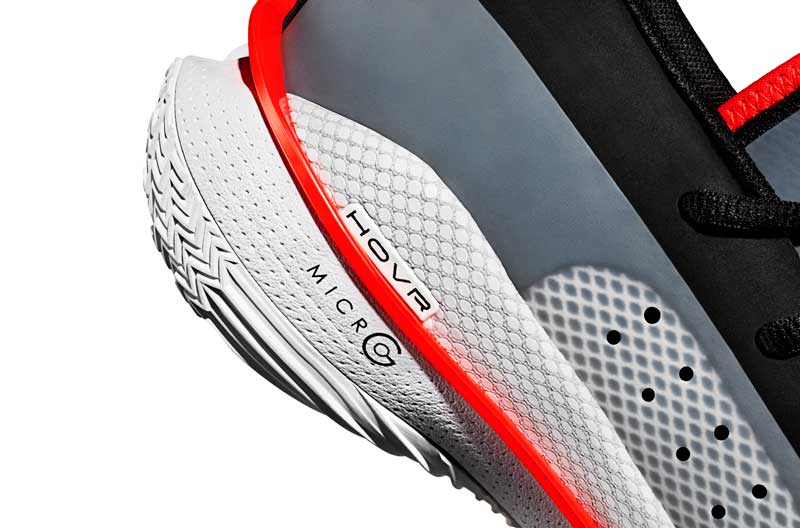 Les nouveautés, c’est sous le pied qu’on les retrouve. L’amorti combine la mousse HOVR et la Micro G. Elles sont séparées par une plaque flexible, qui doit permettre à chaque mousse d’être performante.