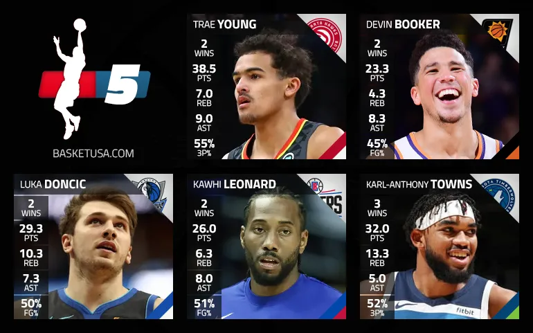 La saison n'a débuté que mardi mais Trae Young impressionne déjà et s'impose logiquement dans le premier cinq de la campagne. À ses côtés, on aurait pu retrouver Damian Lillard, Donovan Mitchell ou l'étonnant Kendrick Nunn, mais la belle première semaine de Phoenix, et le jeu équilibré de Devin Booker sont à souligner.