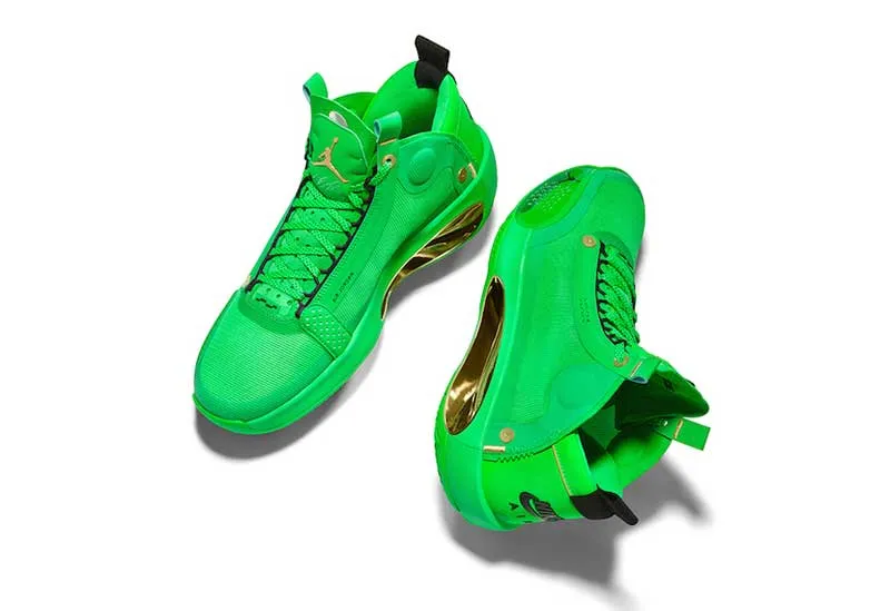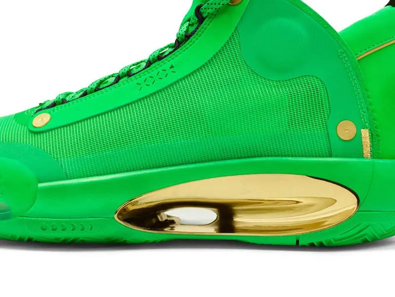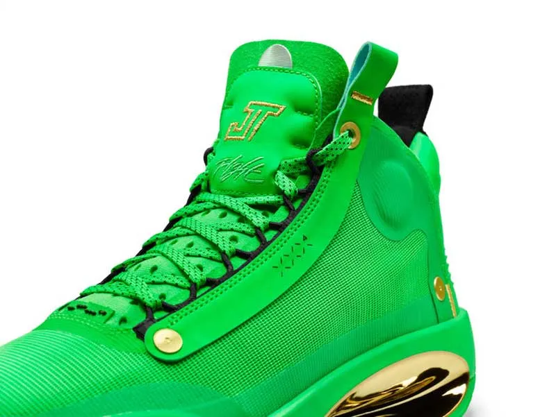 Inutile de la chercher dans les magasins, cette Air Jordan 34 est réservée à Jayson Tatum. Ses initiales sont sur la languette, et le coloris est évidemment dédié aux Celtics.
