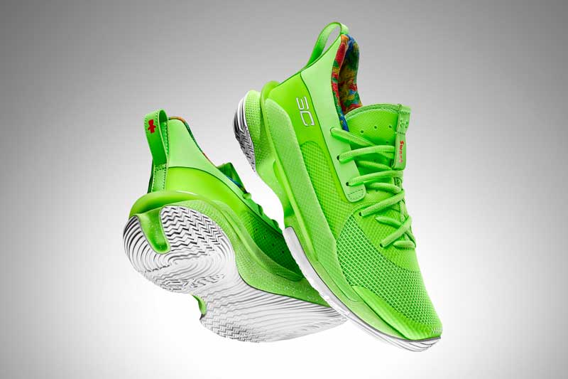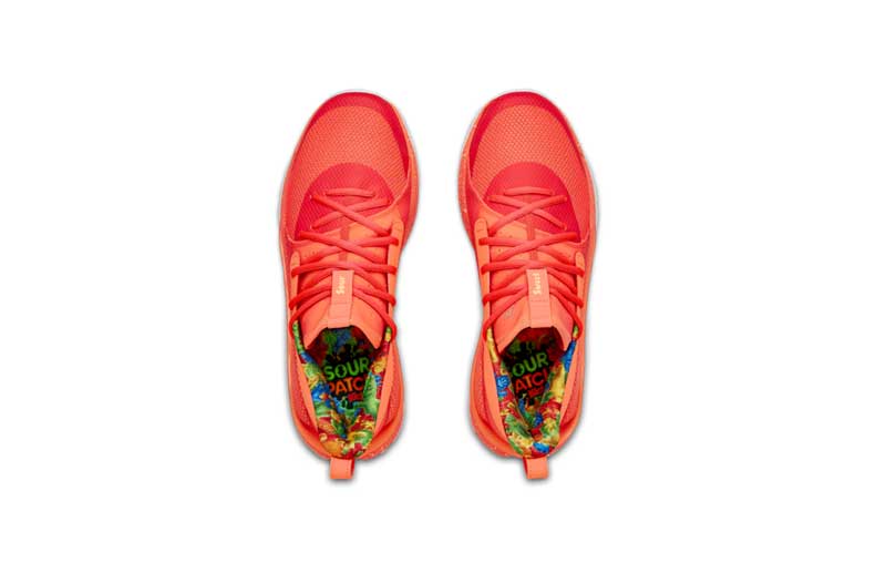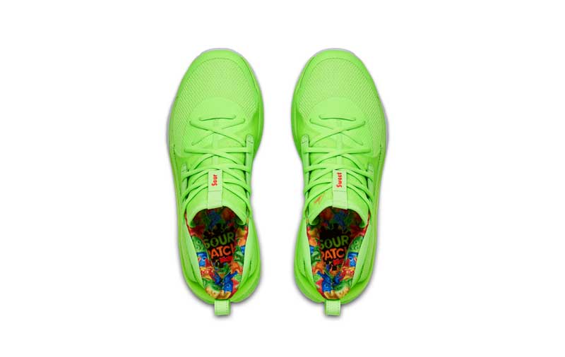 Les deux prochains coloris de la Curry 7 seront une collaboration avec les bonbons Sour Patch Kids. Les couleurs sont donc très vives. Pêche et citron vert seront mis en vente. Les logos Stephen Curry et Sour Patch Kids seront même imprimés sur le papier de soie entourant la chaussure dans la boite, en plus d’apparaître au talon. Des chaussures en forme de bonbons pour faire de l’exercice et évacuer les bonbons absorbés sur le canapé. La boucle est bouclée.