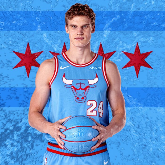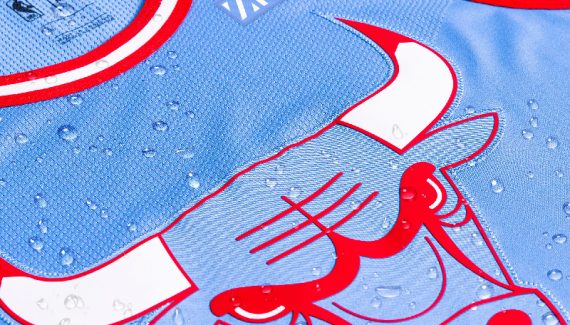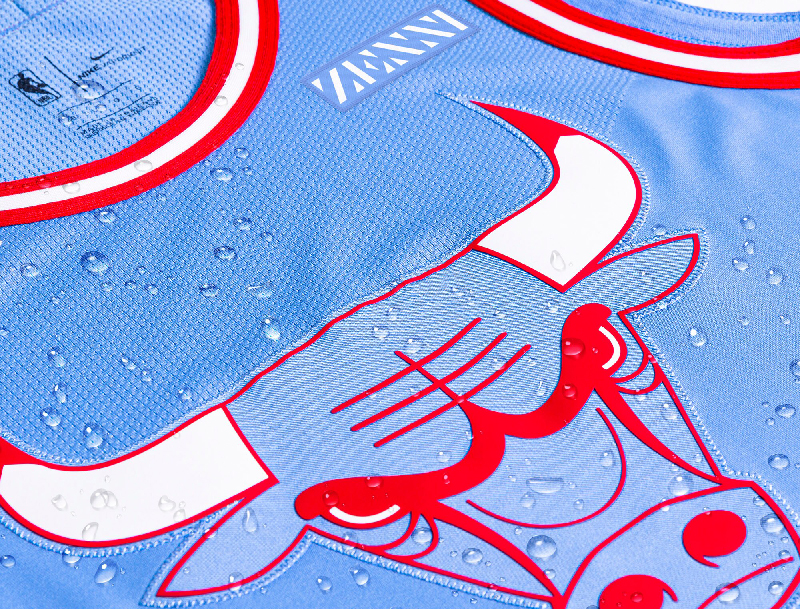 Inspiré par le drapeau de Chicago, le lac Michigan et les branches de la rivière Chicago, le maillot se pare principalement d’une teinte bleue pâle et d’un taureau au rouge fort vif sur le torse.