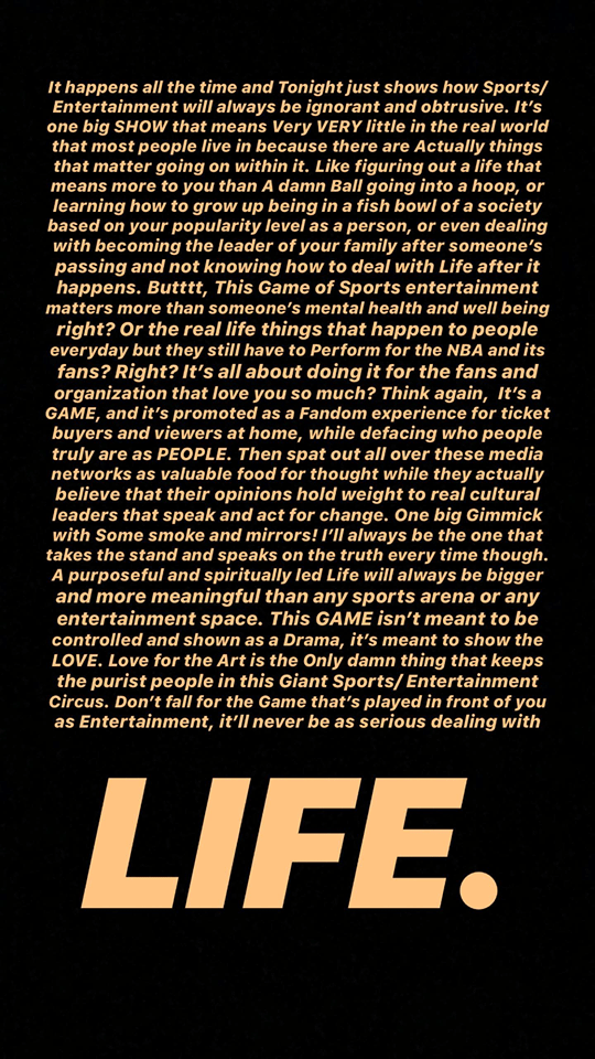 « Comme se construire une vie qui veut dire davantage pour vous que le fait de mettre une putain de balle dans un cercle, apprendre à grandir dans une société où ta popularité te définit, ou même devenir le leader de ta famille après le décès de quelqu’un et ne pas savoir comment gérer ta vie ensuite. »
