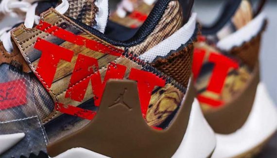 À l’avant de la chaussure et sur la partie arrière, on retrouve les trois lettres qui servent d’abréviation au trinitrotoluène, explosif découvert en 1863 puis utilisé de manière massive lors de différents conflits armés. Le tout sur un motif qui rappelle le bois d’une caisse.
