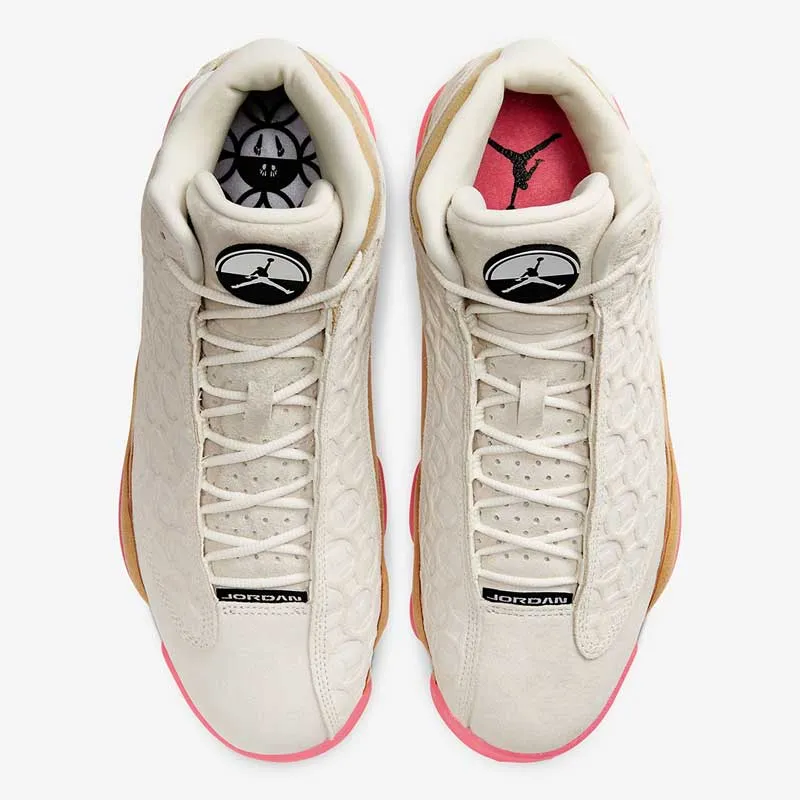 Elle ne ressemble plus vraiment à une chaussure de basket, mais cette Air Jordan 13 basse a le mérite de l'originalité. L'empeigne en daim très soignée propose un blanc légèrement cassé, avec un motif directement en relief. Sur la partie basse et le talon, on retrouve du beige.