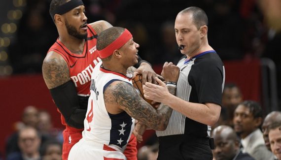 Alors que ce match entre Portland et Washington commençait tranquillement comme des centaines d’autres, le meneur de jeu a perdu son sang froid après une minute trente : coincé au bord du terrain avec Carmelo Anthony et Damian Lillard, « IT » sort du parquet et pousse l’arbitre. Juste ce qu’il faut pour se faire éjecter.