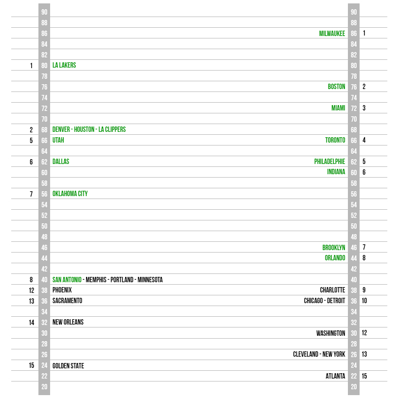 Logiquement, on retrouve le Top 7 de l’Ouest et le Top 6 de l’Est à droite de la diagonale, et on peut situer le profil des différentes formations. Ainsi que l’écart des Bucks avec le reste de la ligue…
