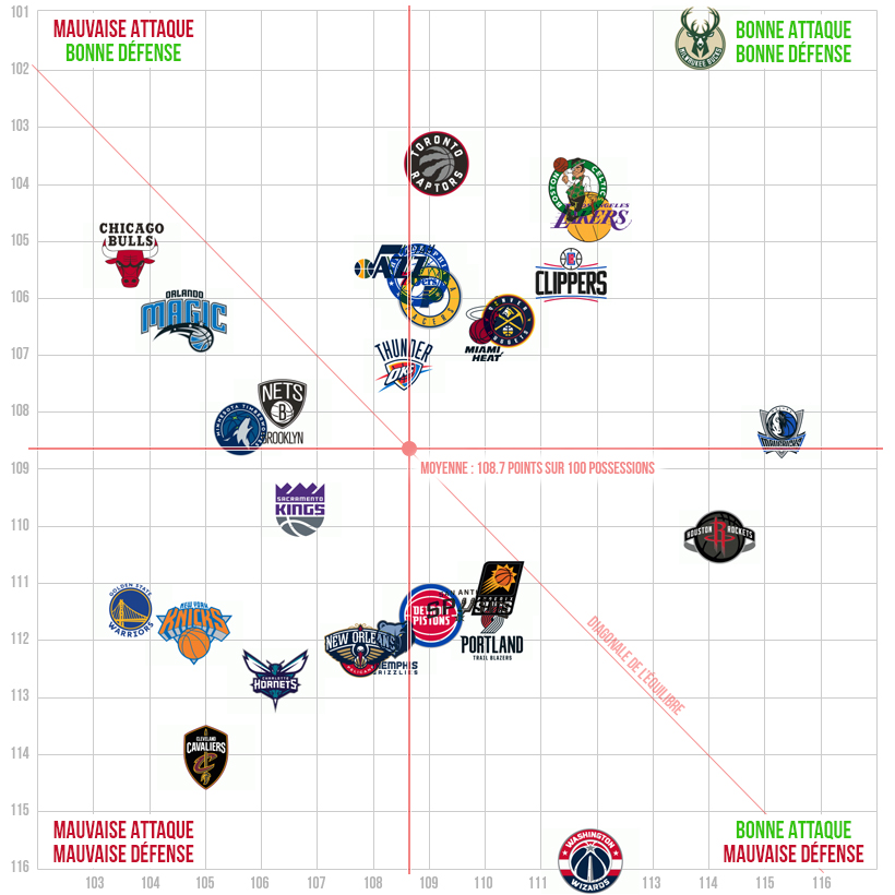 Ces “deux NBA” se retrouvent lorsqu’on situe les équipes par rapport à leurs efficacités offensive et défensive. La moyenne pour les deux données est de 108.7 points (marqués ou encaissés) par 100 possessions. On peut donc tracer une “diagonale de l’équilibre”. À droite, les équipes avec un “Net Rating” positif, celles qui inscrivent plus de points qu’elles n’en encaissent sur 100 possessions. À gauche, les équipes avec un “Net Rating” négatif.