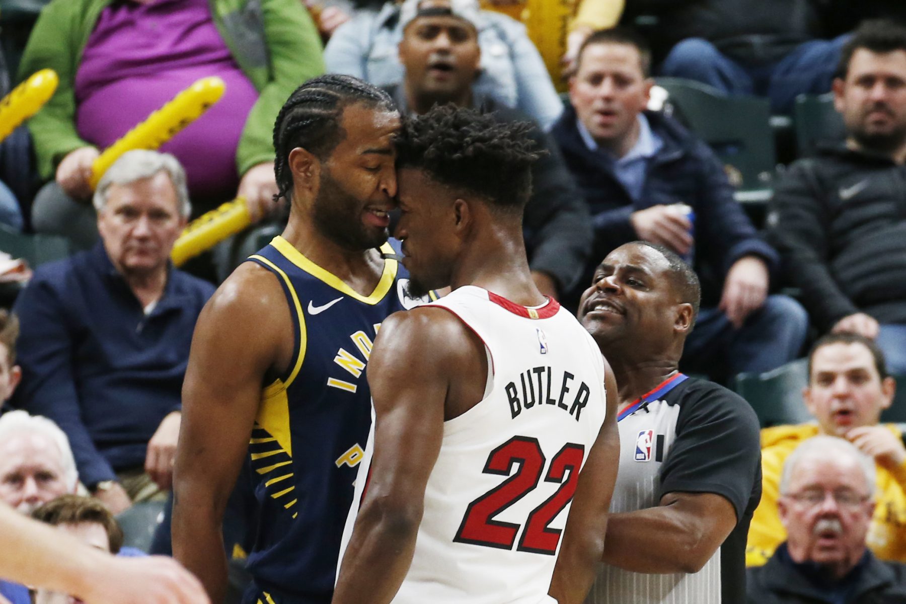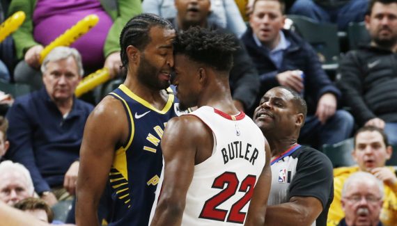 Frustré par ce score de 80-56 en faveur du Heat, T.J. Warren n’a pas hésité à faire une grosse faute sur Jimmy Butler au cours d’une action anodine, dans le troisième quart-temps du match opposant Indiana à Miami. Sauf qu’il s’en est pris à la mauvaise personne : en moins de deux, l’ancien Bull vient coller son front contre celui de son adversaire, obligeant tout le monde à venir les séparer.