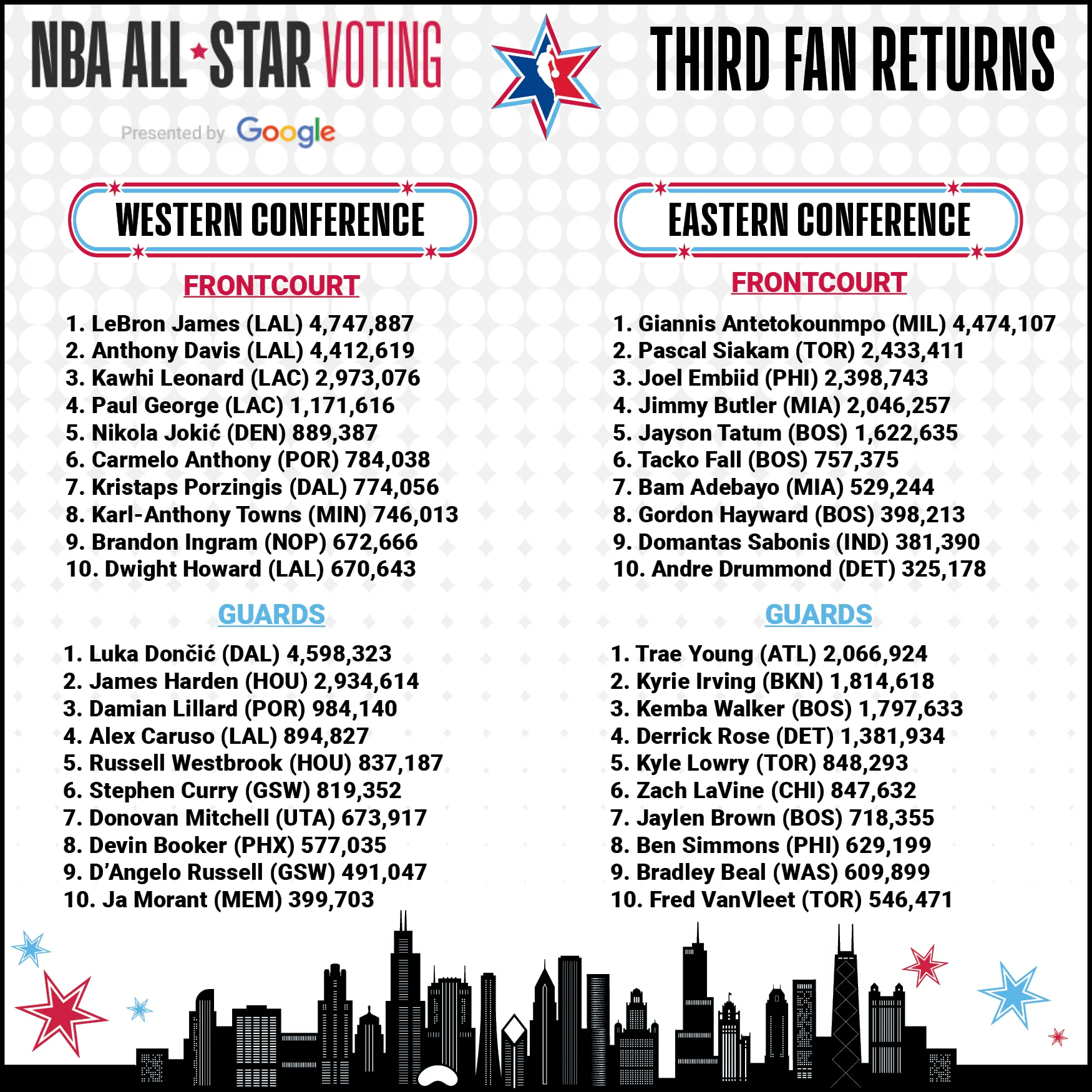 À l'Ouest, LeBron James est ainsi toujours en tête, devant Luka Doncic. Ils seraient accompagnés dans le cinq majeur d'Anthony Davis et Kawhi Leonard pour le froncourt, et de James Harden pour le backcourt. À l'Est, Giannis Antetokounmpo est très largement premier, et il serait de son côté accompagné de Pascal Siakam et Joel Embiid, niveau frontcourt, et toujours de Trae Young et Kyrie Irving niveau backcourt.
