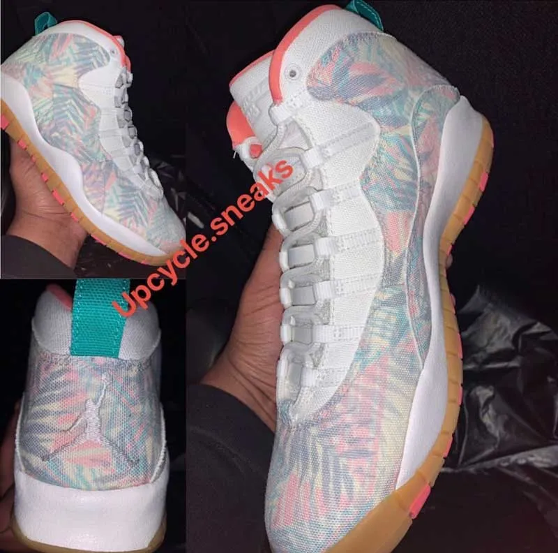 Sur les premiers clichés qui circulent de la Air Jordan X, on retrouve un motif végétal, des touches de rose, de bleu, de vert et de jaune. L'ensemble rappelle les plus belles heures des coloris que Nike imaginait pour LeBron James lors de son passage en Floride.
