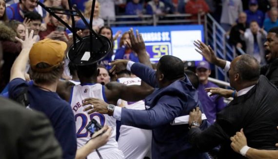Le reste de l’équipe de K-State se rassemble autour de Sousa et une mêlée, puis une bagarre générale éclatent alors même que le match est terminé ! Antonio Gordon et David Sloan, de Kansas State, ont été parmi les premiers à “secourir” leur coéquipier, tandis que De Sousa saisit une chaise pour se protéger, ou attaquer, c’est au choix.