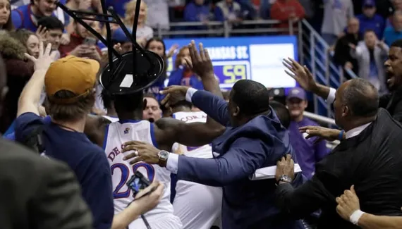 Le reste de l'équipe de K-State se rassemble autour de Sousa et une mêlée, puis une bagarre générale éclatent alors même que le match est terminé ! Antonio Gordon et David Sloan, de Kansas State, ont été parmi les premiers à “secourir” leur coéquipier, tandis que De Sousa saisit une chaise pour se protéger, ou attaquer, c'est au choix.