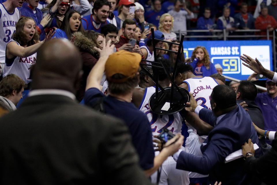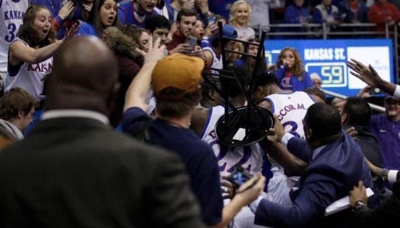 Il faut dire que l’intérieur angolais s’est tristement illustré en distribuant les coups de poing et surtout en attrapant un tabouret dont il semblait vouloir se servir pour continuer la bagarre. Heureusement, l’assistant Jerrance Howard a réussi à se saisir de l’objet par derrière, mais Bill Self ne pouvait que condamner l’attitude de son joueur.