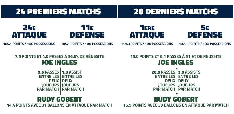 Ce regain d'altruisme a permis à Utah d'enchainer cinq victoires de suite, avant de perdre un match au couteau à Miami. Cette défaite n'a toutefois pas ralenti le Jazz. Avec une identité de jeu retrouvée des deux côtés du terrain, Utah a engrangé 12 victoires lors de ses 13 derniers matchs, dont neuf de 11 points ou plus.