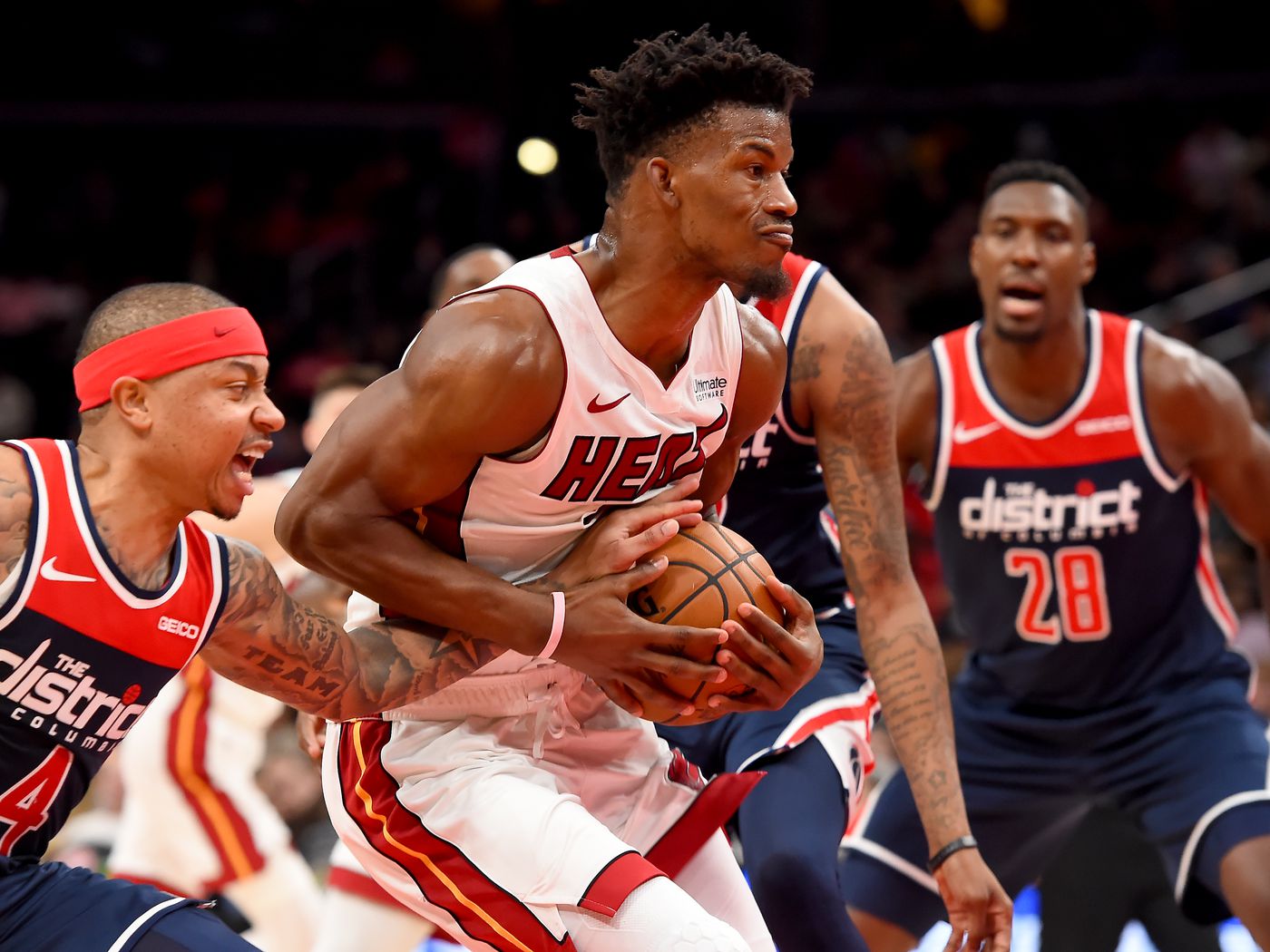 Encore une fois, les Wizards vont réussir un gros run, avec un 19-6 pour repasser devant : à 1 minute 35 de la fin, après deux lay-up de Bradley Beal, ils mènent 118-115. Comme contre Sacramento, James Johnson joue les héros avec un tir primé dans le corner, Bradley Beal rate son tir au buzzer – et même après le buzzer : le Heat retourne en prolongation où là encore, les chiffres sont à son avantage avec un bilan de 7-0. Alors que Washington a perdu cinq fois sur six lors des matchs joués en moins de 5 points.