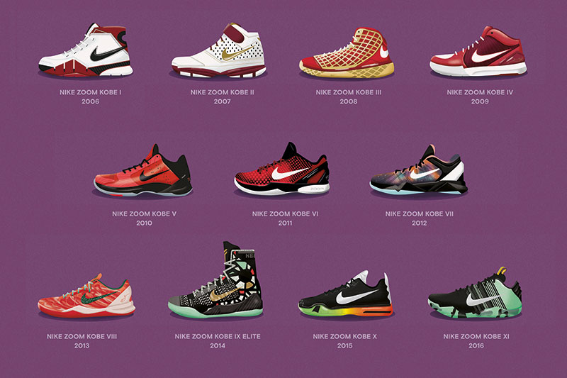 Au fil des années, les modèles de la ligne Kobe deviennent ceux qui donnent le ton chez Nike. Le Flyknit, les configurations Zoom Air, les semelles interchangeables… Chaque sortie est un petit événement, et certains modèles établissent des nouveaux standards de performance, à l’image de la superbe Kobe XI, modèle d’une pureté et d’une efficacité redoutable, la dernière chaussure portée par le joueur en match officiel.