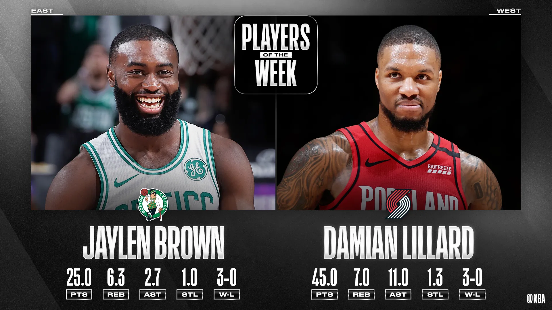 Aucune surprise à l'Ouest puisqu'avec ses 45 points, 11 passes et 7 rebonds de moyenne, et trois victoires en trois sorties, c'est évidemment Damian Lillard qui est élu “joueur de la semaine” par la NBA.