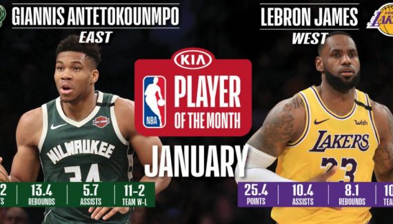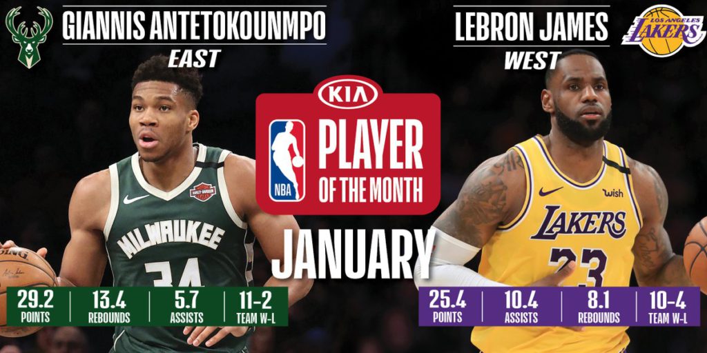 Comme chez les rookies, aucune variété pour le trophée de “Player Of The Month” de la côte Est puisque Giannis Antetokounmpo réalise le triplé avec un mois de janvier à 29.2 points, 13.4 rebonds et 5.7 passes par match. Il devance dans les votes Bradley Beal, Zach LaVine, Domantas Sabonis, Collin Sexton et Ben Simmons.