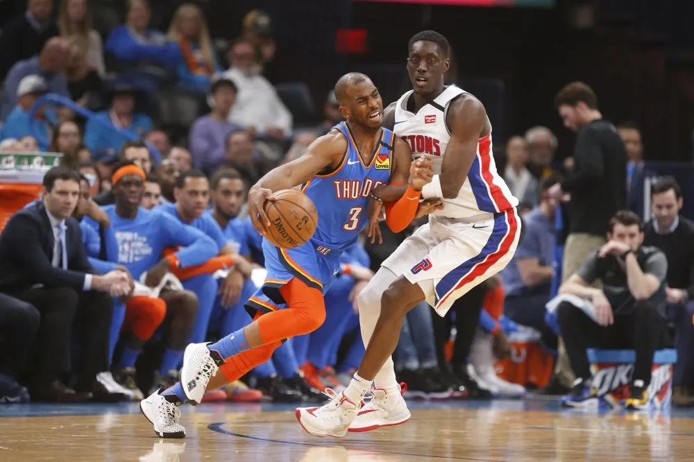 Chris Paul et Dennis Schroder doivent s'employer pour permettre à OKC de prendre le dessus malgré la bonne entame des Pistons emmenés par Christian Wood (29-24). Reggie Jackson et Thon Maker prennent le relais au scoring mais la paire Bazley-Adams maintient les locaux à distance (43-40).
