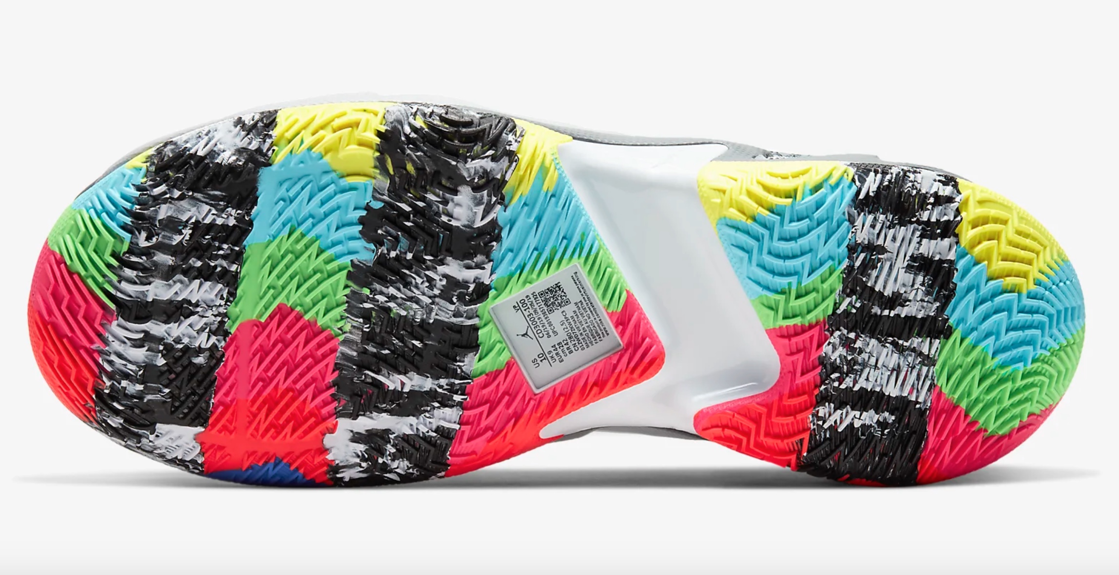 Justement, la division de la semelle en deux partie indépendantes n’a pas d’influence sur la traction, pour ceux que ça inquiète. Celle-ci est assurée par un système d’accroche multidirectionnel qui recouvre entièrement la semelle, Jordan ayant laissé tomber les motifs circulaires des Why Not Zer0.2. Pas de glissade à déplorer.