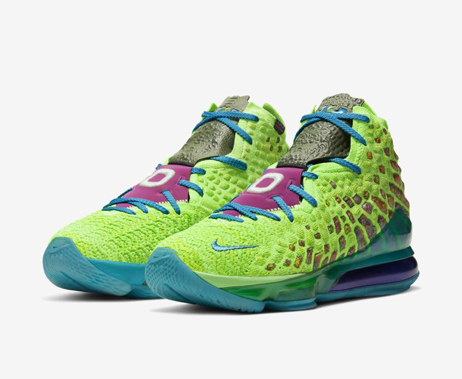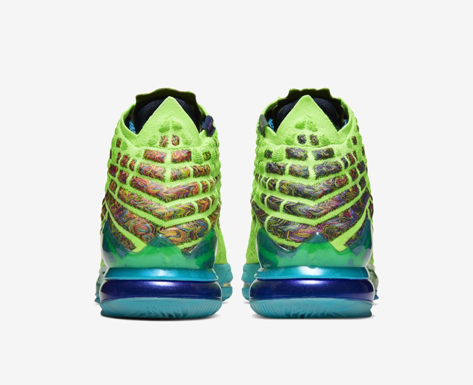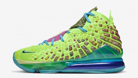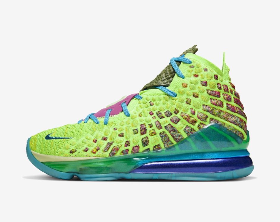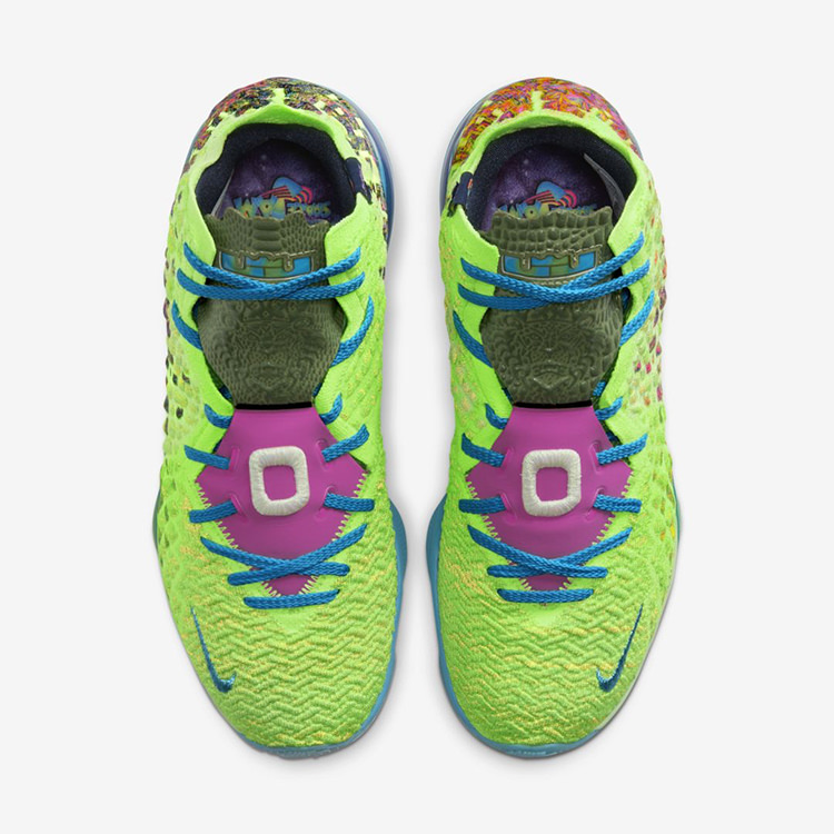 La gamme Space Jam de la LeBron 17 a désormais trois coloris : le bleu-blanc-rouge de la « Tune Squad » sur la version basse, le mauve et orange de la « Monstars », porté par le King lors des trois premiers quart-temps du All-Star Game, et le vert néon de la version « Mr. Swackhammer », qu’il a dévoilé lors du quatrième quart en changeant de paire. Et qui a donc reçu un joli coup de projecteur avec cette fin de match à suspense.