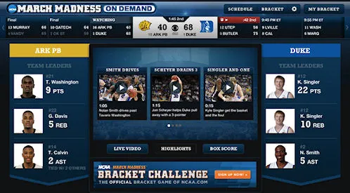 En effet, la NCAA proposera à partir du 10 mars une application qui permettra de regarder tous les matches de la March Madness. C'est gratuit, ça fonctionne via Wi-Fi ou 3G, et c'est l'équivalent du NBA League Pass pour le tournoi NCAA (du 15 mars au 4 avril).