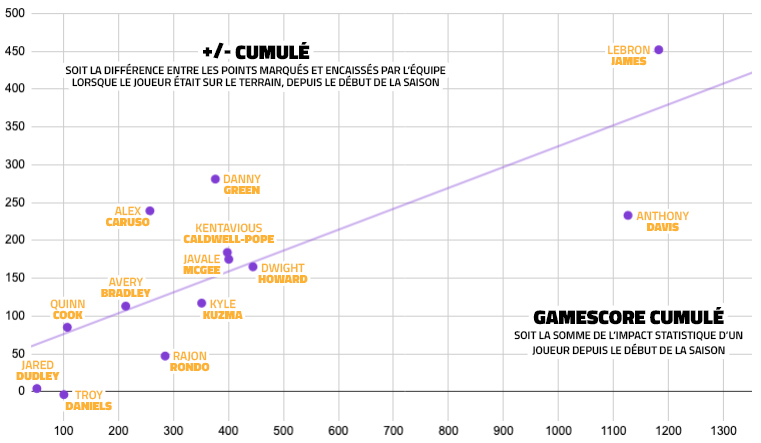 Comment l’expliquer ? En représentant le “GameScore” cumulé, soit la production statistique des joueurs de la rotation de Frank Vogel depuis le début de saison, par rapport au +/-, c’est-à-dire à l’écart créé lorsque ces joueurs sont sur le terrain, on peut voir un lien logique entre les deux. Avec un +/- global de +452 (soit la différence entre les points marqués et les points encaissés par les Lakers lorsqu’il est sur le terrain depuis le début de saison), LeBron James est très largement en tête de la catégorie, devant Danny Green (+281) et Alex Caruso (+239). Malgré une production statistique largement supérieure, Anthony Davis (+233) n’est de son côté que quatrième.
