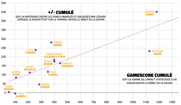 Comment l'expliquer ? En représentant le “GameScore” cumulé, soit la production statistique des joueurs de la rotation de Frank Vogel depuis le début de saison, par rapport au +/-, c'est-à-dire à l'écart créé lorsque ces joueurs sont sur le terrain, on peut voir un lien logique entre les deux. Avec un +/- global de +452 (soit la différence entre les points marqués et les points encaissés par les Lakers lorsqu'il est sur le terrain depuis le début de saison), LeBron James est très largement en tête de la catégorie, devant Danny Green (+281) et Alex Caruso (+239). Malgré une production statistique largement supérieure, Anthony Davis (+233) n'est de son côté que quatrième.
