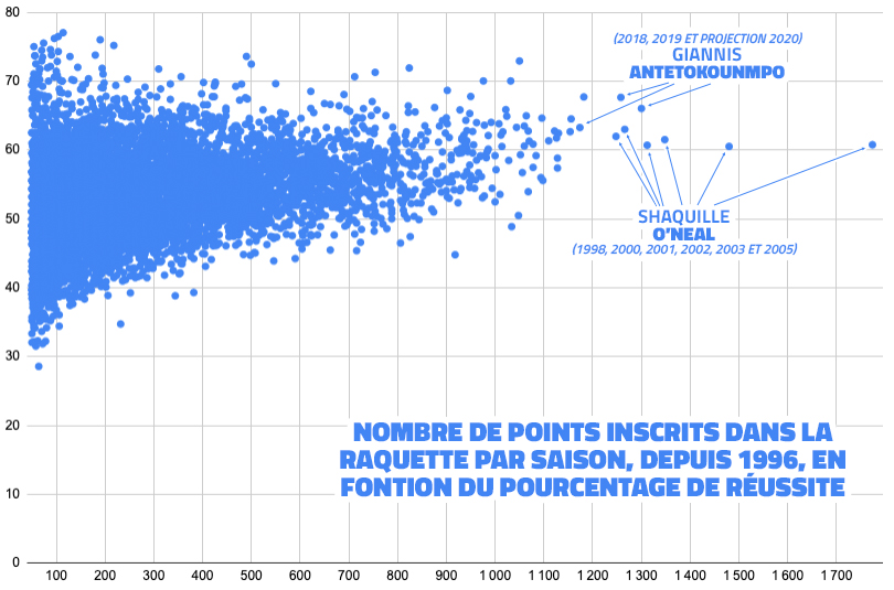 À une époque où le jeu intérieur est de plus en plus délaissé au profit du tir à 3-points (le nombre d’actions au poste bas a par exemple diminué de 45% entre la saison 2013-14 et aujourd’hui), le « Greek Freak » fait la loi dans les raquettes adverses, avec un peu plus de 18 points marqués chaque soir dans ce domaine. C’est simple, on n’avait pas vu un joueur aussi souverain dans la peinture depuis le « Shaq », dans sa grande période, qui inscrivait entre 20 et 23 points par match dans la raquette, entre les saisons 1999-00 et 2002-03.