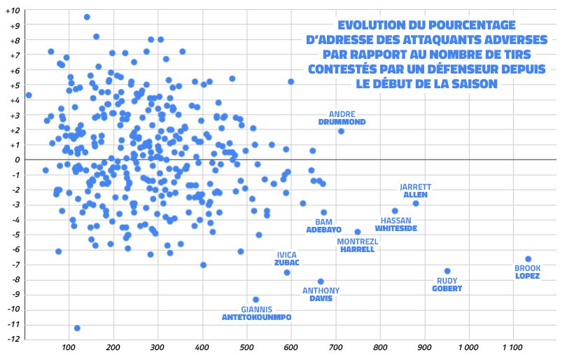 Avec 1 133 tirs contestés depuis le début de saison, Brook Lopez est en effet largement leader dans la catégorie, devant Rudy Gobert (951), Jarrett Allen (880) et Hassan Whiteside (833). Surtout, il est efficace dans l’intimidation puisque le pourcentage de réussite des attaquants qui shootent face à lui baisse de 6.6 points de pourcentage. C’est moins bien que le Français (-7.4) mais bien mieux que Jarrett Allen (-2.9) ou Hassan Whiteside (-3.4).
