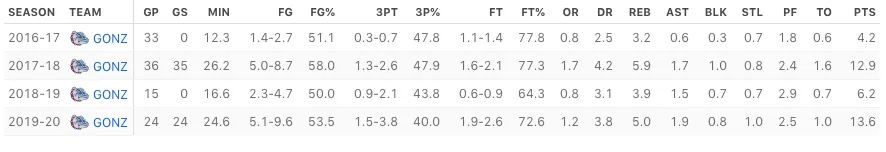 Après quatre années à porter la tunique des Bulldogs, l'intérieur tricolore de 22 ans va avoir la possibilité de revenir l'an prochain sur le campus de Spokane puisque le tournoi final est annulé, ou de sauter le pas vers le monde professionnel. La NBA est en ligne de mire, mais pourquoi pas l'Euroleague si ça coince à la Draft ?