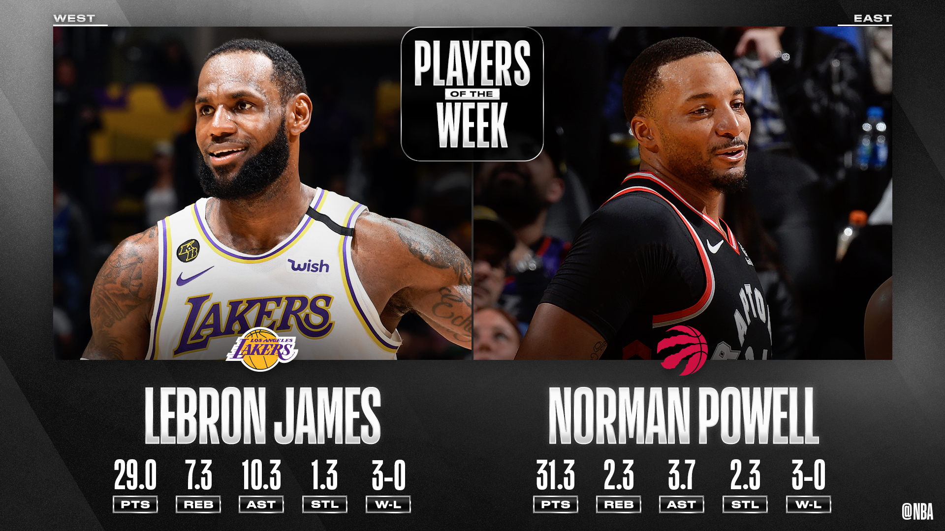 Cette semaine, le “King” a en tout cas marqué les esprits, avec 29 points, 10.3 passes et 7.3 rebonds de moyenne, alors que c’est le bouillant Norman Powell qui l’accompagne à l’Est, avec 31.3 points, 2.3 rebonds et 3.7 passes de moyenne en trois victoires avec les Raptors (Phoenix, Golden State, Sacramento). Pour lui, c’est une première.