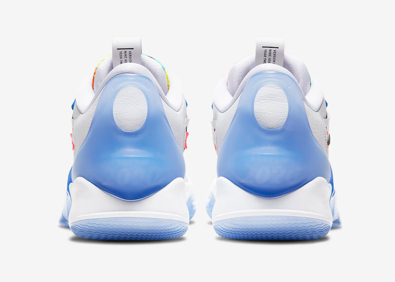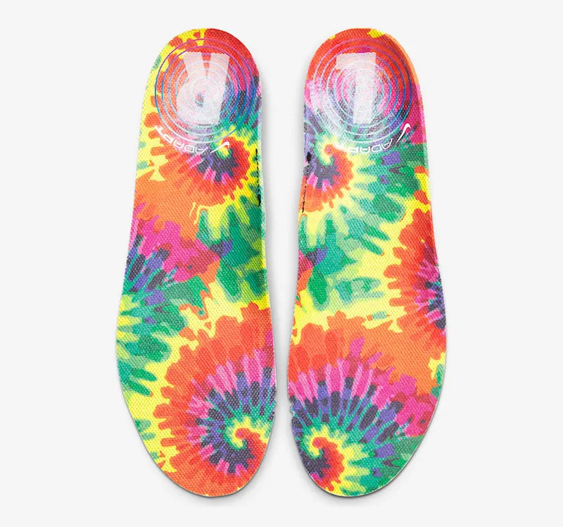 Sous une base blanche, on retrouve une empeigne digne de Woodstock, avec une base orange, mais aussi des touches de jaune, de bleu, de rose ou de rouge. Le tout est accompagné par une semelle et des empiècements translucides.