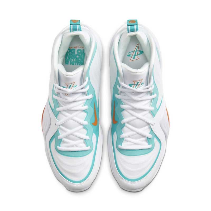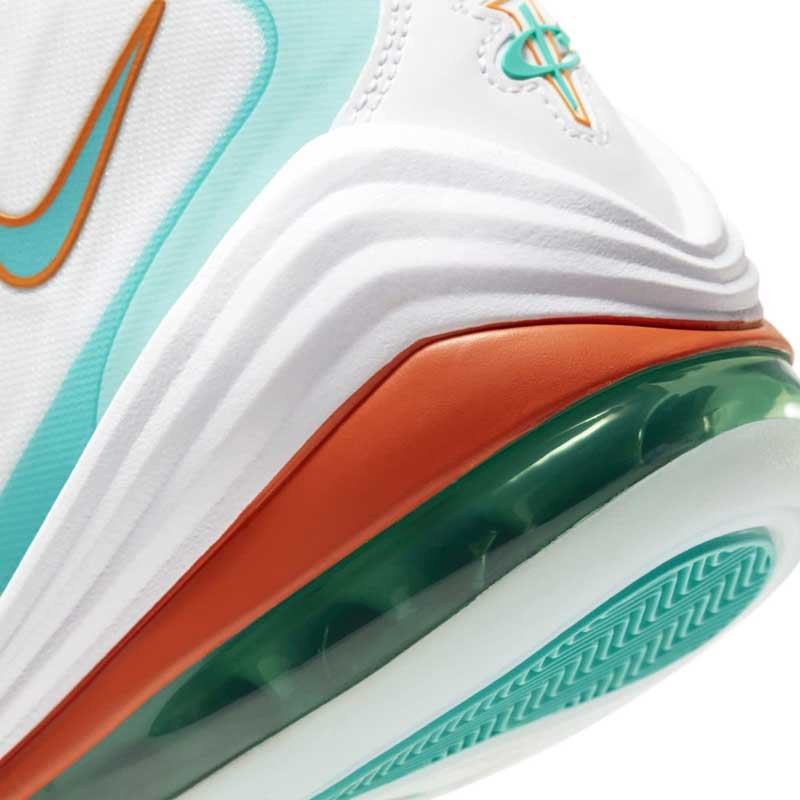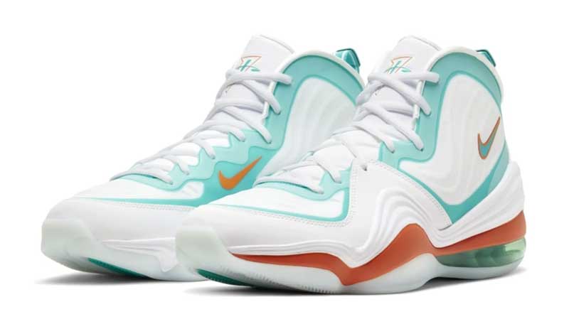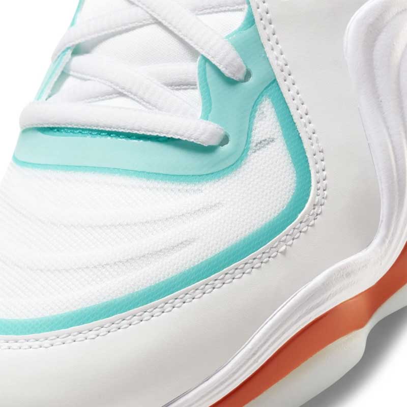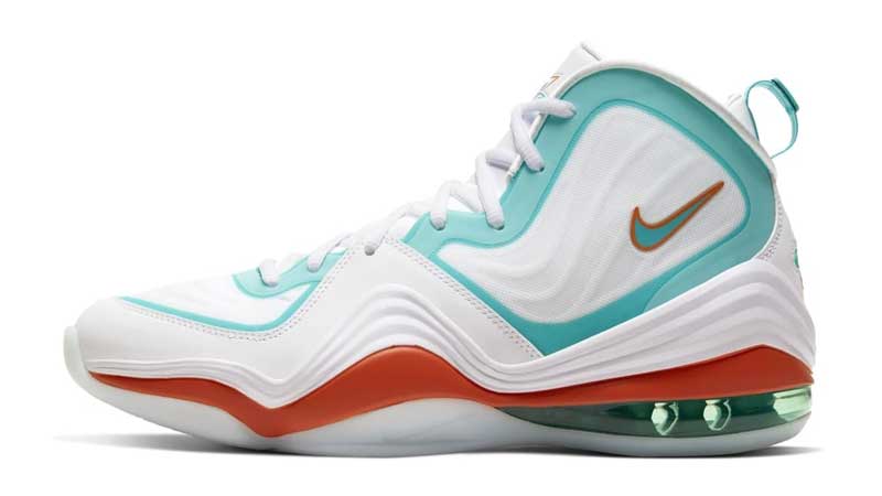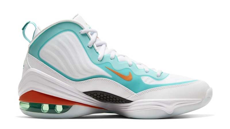 La chaussure de Penny Hardaway avait déjà flirté avec la NFL par le passé, mais ce coloris est inédit. Le résultat est plutôt convaincant, avec une base blanche qui permet de parfaitement mettre en valeur les couleurs vives et rappeler le maillot domicile des Dolphins.