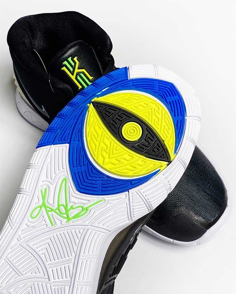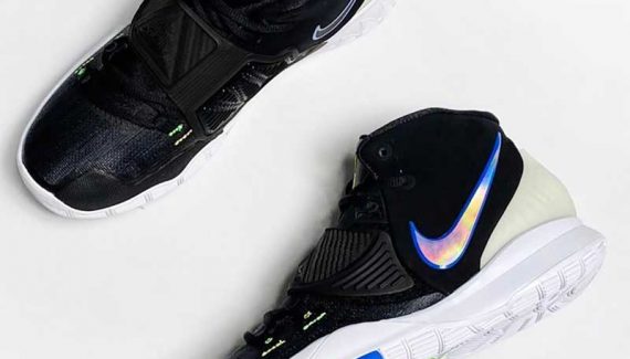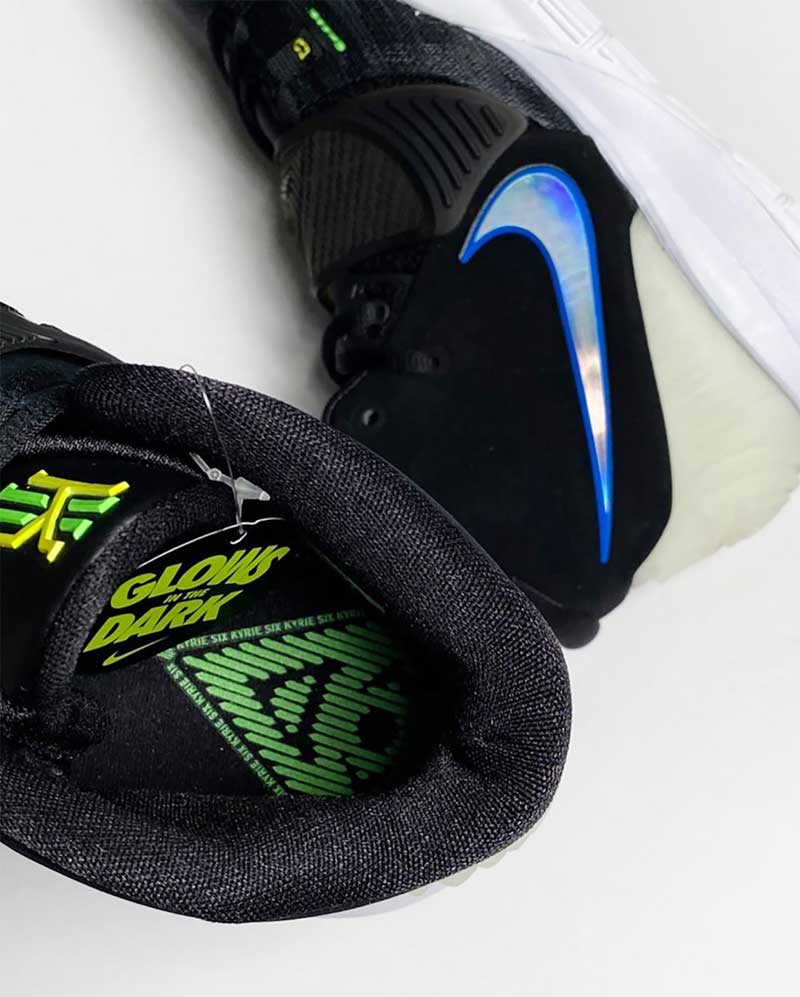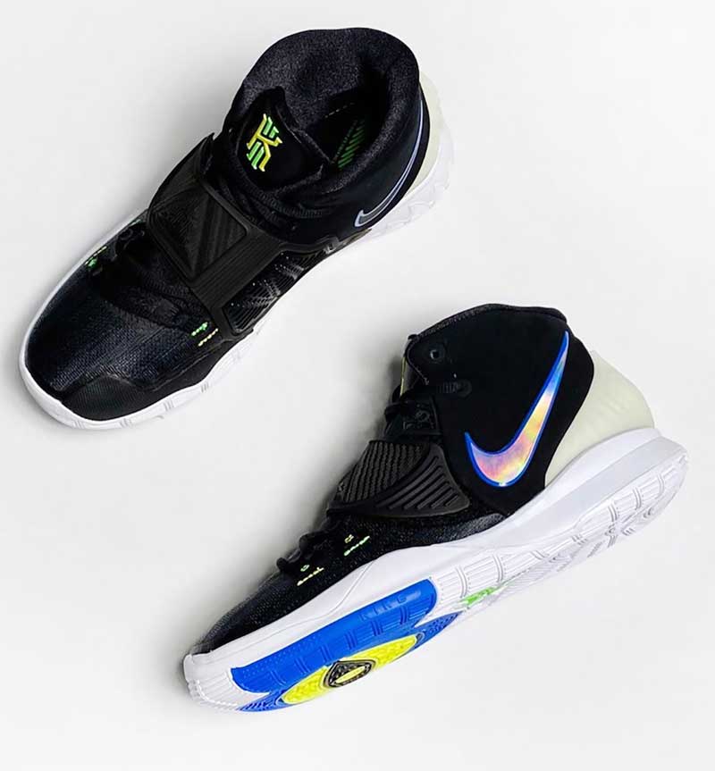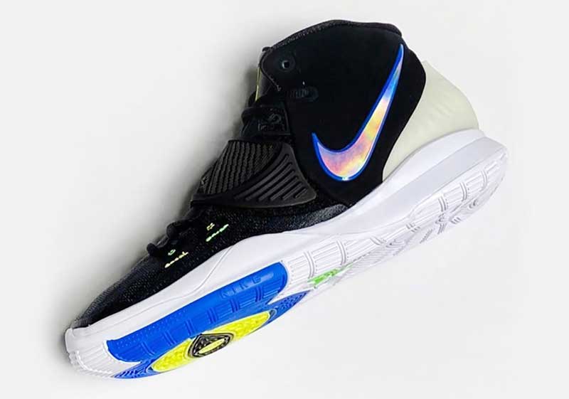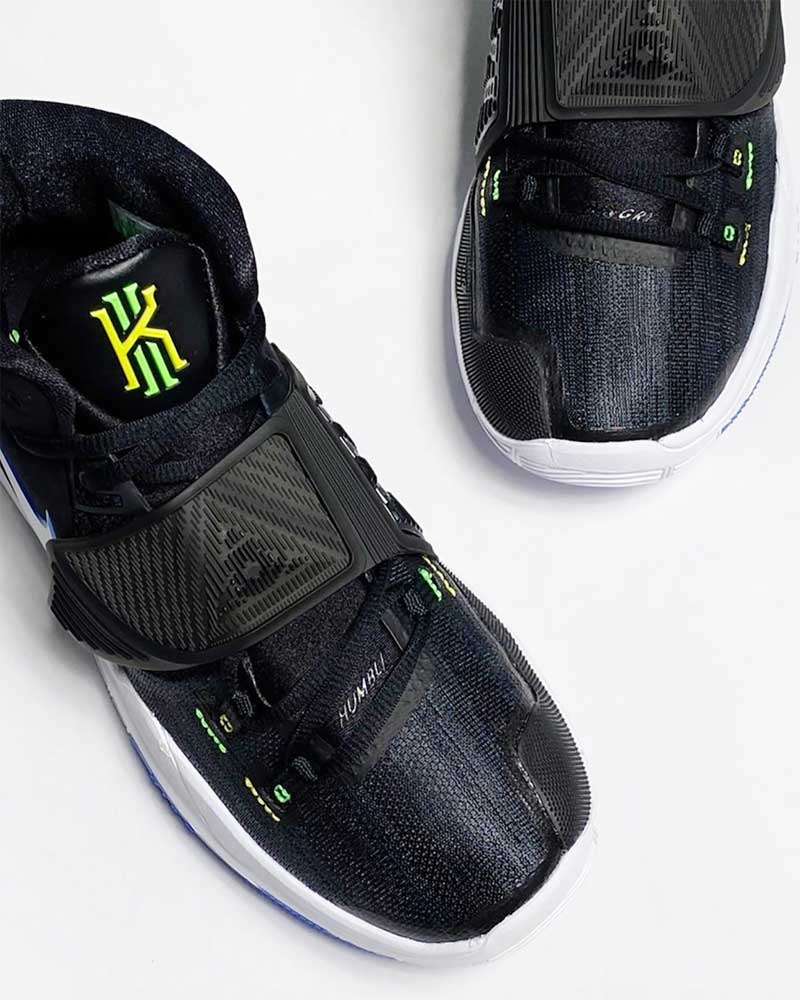 Une base noire, une semelle blanche, quelques touches de bleu. Rien de bien original à première vue pour la Kyrie 6 prévue le 1er avril.