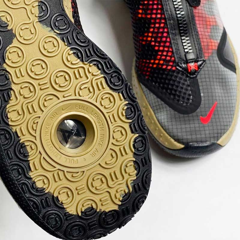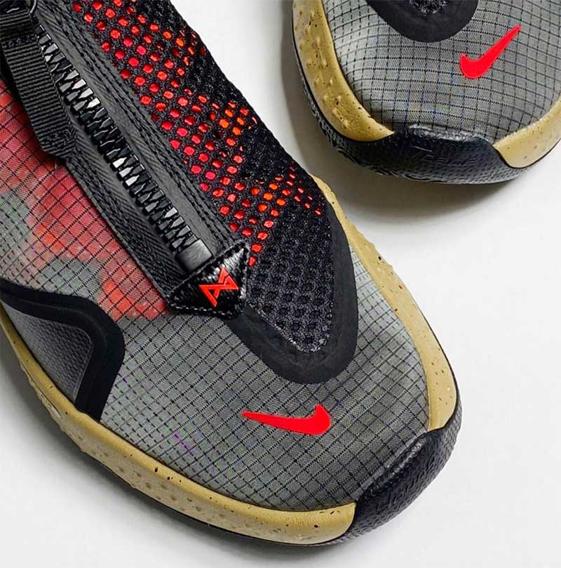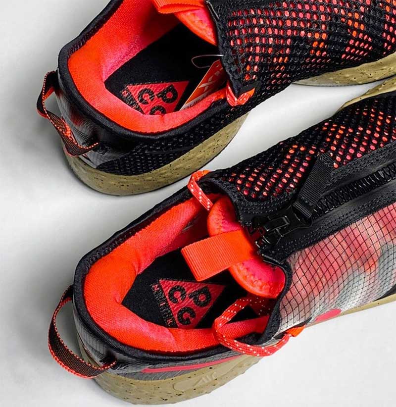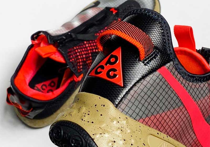 Sa chaussure signature change carrément de matériaux, pour adopter une tige transparente. Au talon, le logo ACG (All Condition Gear) est détourné pour devenir “PCG.” Preuve que le coloris a été imaginé pour ceux qui aiment mettre les pieds dans la terre, la semelle brune semble avoir voyagé.
