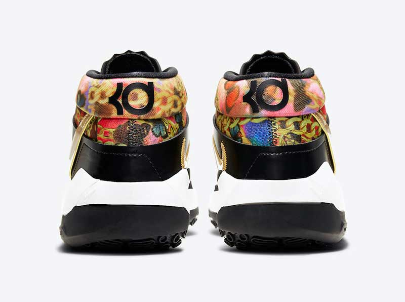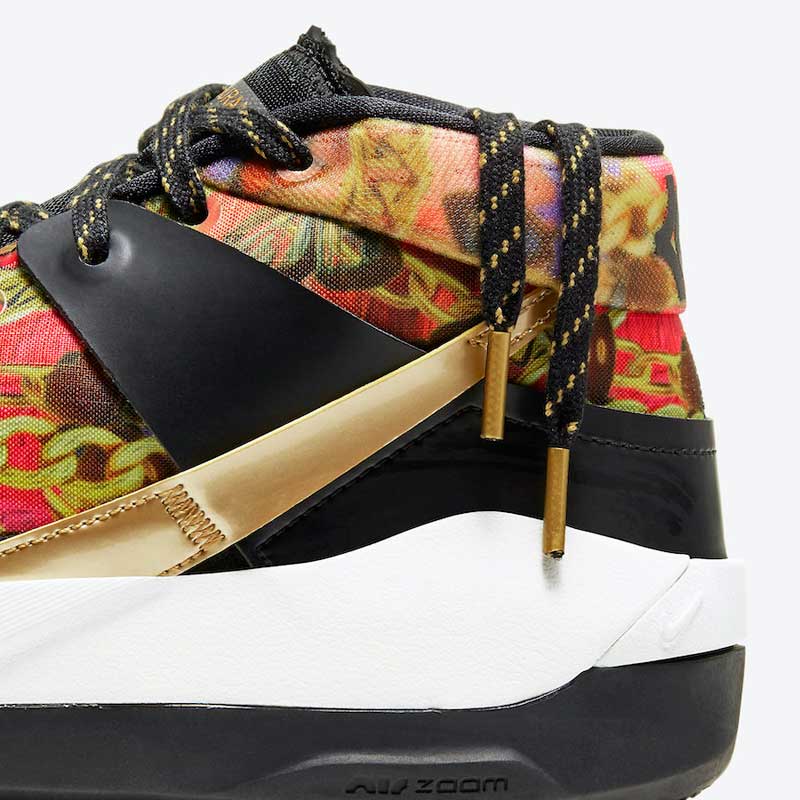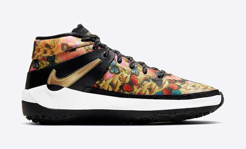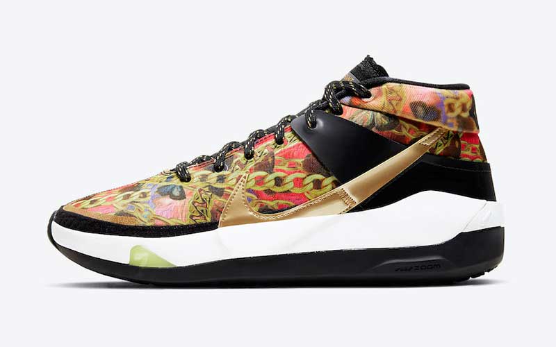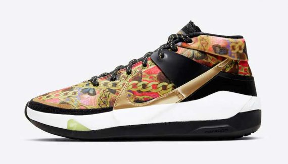 Le 17 mai, la chaussure de Kevin Durant va être recouverte d’un motif qui mélange les chaînes et les papillons. Une virgule dorée complète le tableau. L’ensemble rappelle les plus beaux foulards des marques de luxe. Forcément, tout le monde ne pourra pas assumer un tel style.
