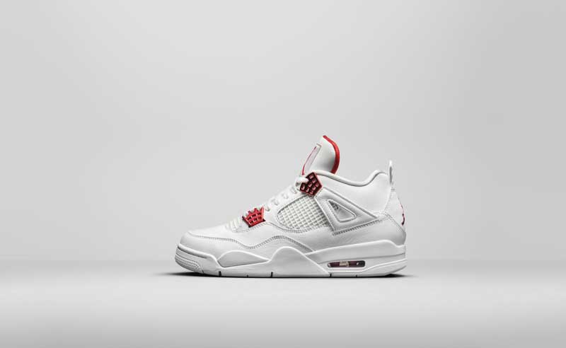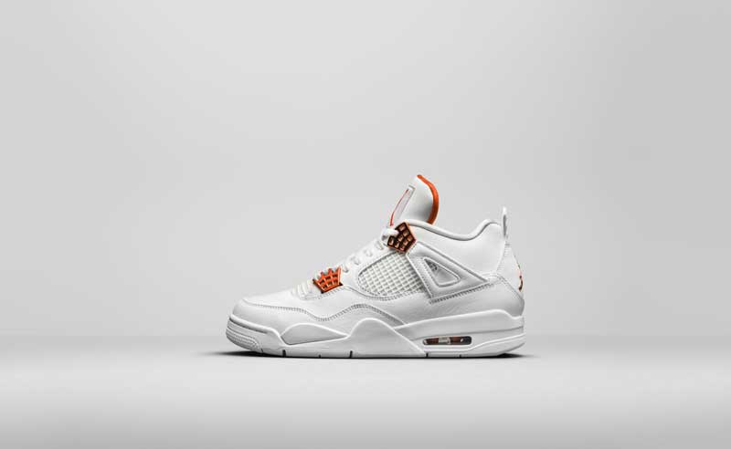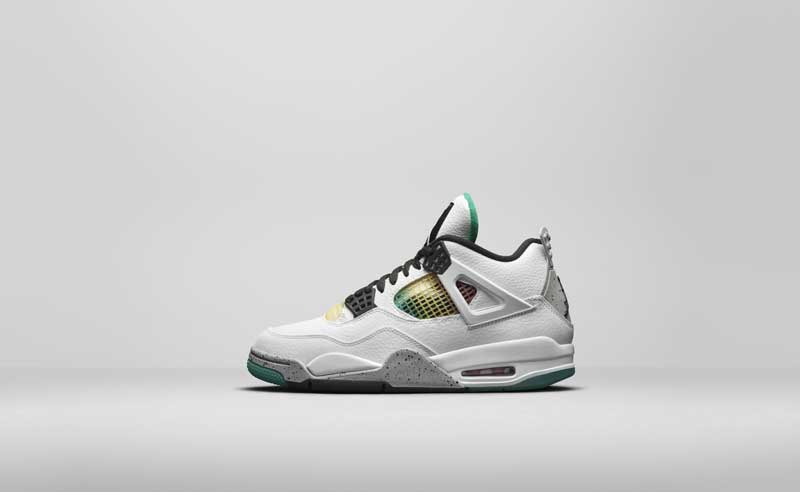 Pour la Air Jordan 4, c’est quatre coloris imaginés sur la même base blanche. Ce sont juste les accents qui changent sur le passage des lacets, le logo et la doublure. Rouge, vert, orange ou mauve. À vous de choisir.