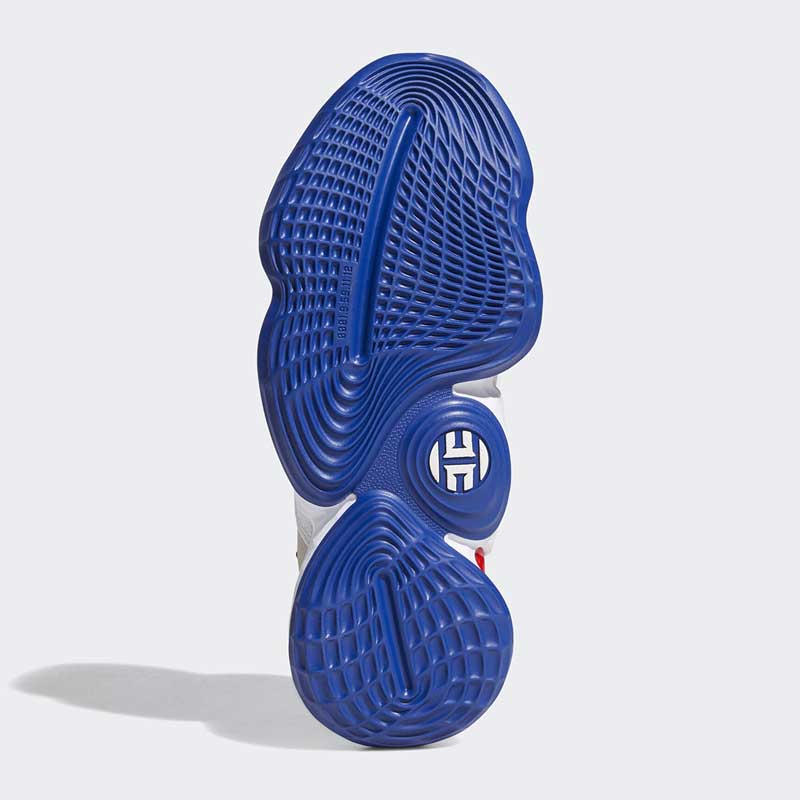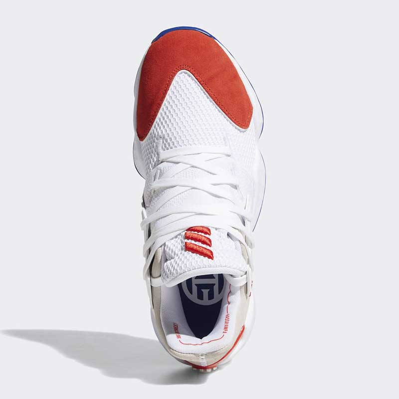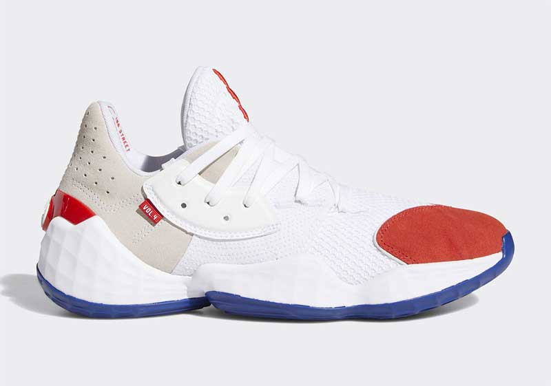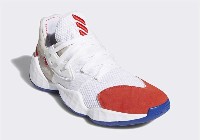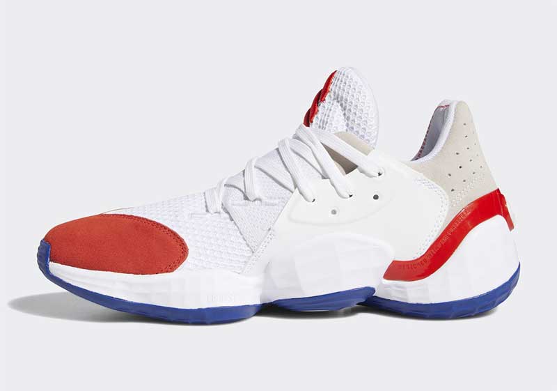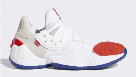 Base blanche, empiècements rouges et semelle bleue. C’est bien la Question d’Allen Iverson qui se pose sur la signature de James Harden. Un emprunt inhabituel mais qui fonctionne plutôt bien.