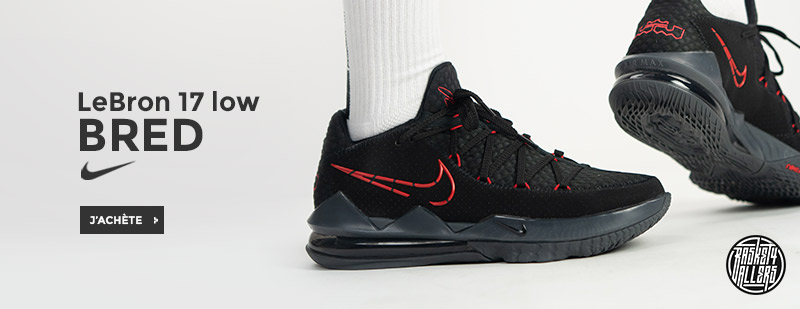 Procurez-vous maintenant la Lebron 17 Low Bred dans son coloris noir souligné de détails rouge pour vous démarquer sur le terrain à la manière de King James