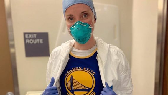 « Hey Steph, voici toute l’équipe ! », lance Shelby Delaney, masque sur la bouche et bandana à l’effigie des Warriors sur la tête, en tournant son téléphone. Cette infirmière de l’unité de soins intensifs du centre médical Alta Bates Summit, hôpital situé dans la baie de San Francisco, s’est fait remarquer par un récent message sur Facebook.
