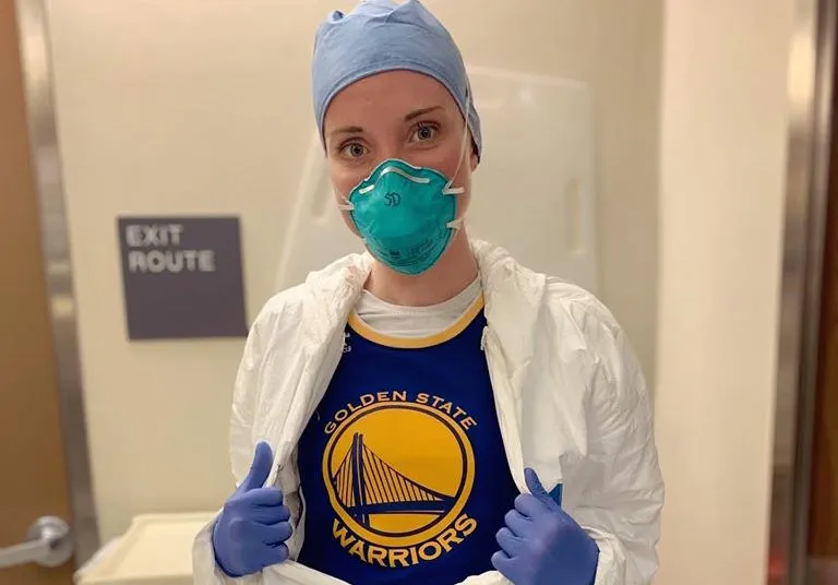 « Hey Steph, voici toute l'équipe ! », lance Shelby Delaney, masque sur la bouche et bandana à l'effigie des Warriors sur la tête, en tournant son téléphone. Cette infirmière de l'unité de soins intensifs du centre médical Alta Bates Summit, hôpital situé dans la baie de San Francisco, s'est fait remarquer par un récent message sur Facebook.