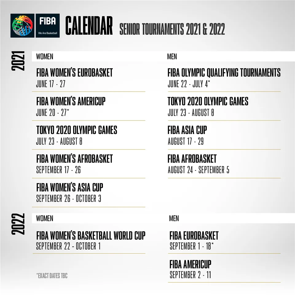 L'Afrobasket et l'Asia Cup 2021 sont eux légèrement repoussés pour ne pas empiéter sur les Jeux olympiques. La compétition africaine est donc prévue du 24 août au 5 septembre, celle en Asie du 17 au 29 août 2021.