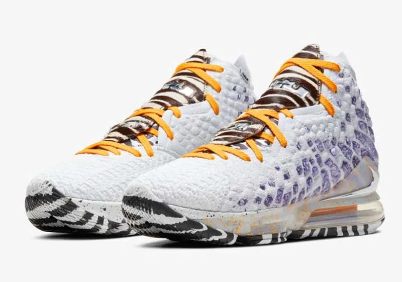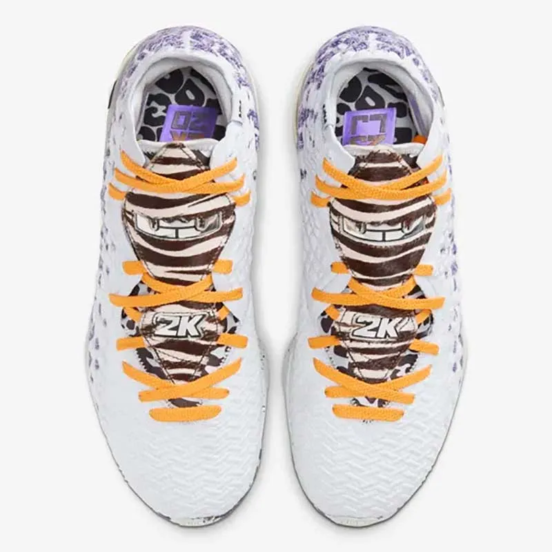 Une superbe chaussure blanche sur laquelle on retrouve des touches de pourpre et or, ainsi qu'un motif zébré. Une paire idéalement assortie aux maillots blancs des Lakers.