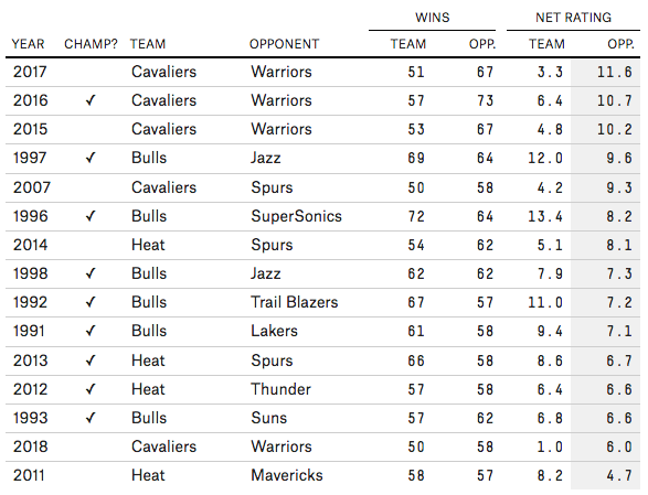 Il a notamment défié trois fois des Warriors qui affichaient un “Net Rating” supérieur à +10 (2015, 2016 et 2017), alors que la meilleure équipe affrontée par “MJ” en Finals, le Jazz de 1997, n’était qu’à +9.6. Mais il a aussi affronté des adversaires plus faibles, comme les Mavericks de 2011, et leur “Net Rating” de +4.7.