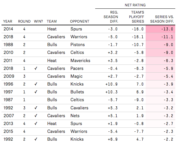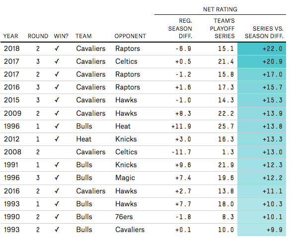 Dans cette période, les équipes de LeBron James avaient ainsi tendance à “surperformer” en playoffs.